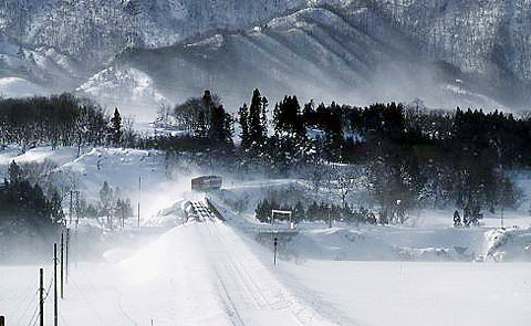 ![]() 強烈な地吹雪が線路を襲います。下り列車から1時間とたたないうちに レールは雪の中へ。上り列車が雪煙を上げて走って行きました。 横川目-和賀仙人 |
